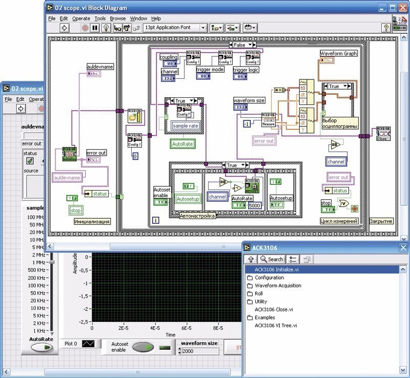 Полный комплект разработчика программного обеспечения ACK-3106_SDK содержит инструментальный драйвер для двухканальных цифровых запоминающих осциллографов AKTAKOM ACK-3106, ACK-3116, ACK-3106L, АСК-3172 и четырёхканальных ACK-3107, ACK-3107L, АСК-3117 и ACK-3174, а также модулей осциллографов в составе комбинированных приборов АСK-4106, ACK-4106L, ACK-4114, АСК-4174, ACK-4166, ACK-4176. Драйвер содержит все необходимые функции для работы с прибором и представляет собой динамическую библиотеку (DLL) Windows, сопровождаемую заголовочным файлом для языка Си, функциональным деревом LabWindows и полностью повторяющей его библиотекой инструментов для LabVIEW. Дополнительно (в отличие от базовой версии АСК-3106_SDK_base) прилагаются примеры программирования ACK-3106, ACK-3116, ACK-3106L, АСК-3172, ACK-3107, ACK-3107L, АСК-3117 и ACK-3174, АСK-4106,ACK-4106L, ACK-4114, АСК-4174, ACK-4166, ACK-4176 с использованием описываемого драйвера в LabWindows и LabVIEW в различных режимах.